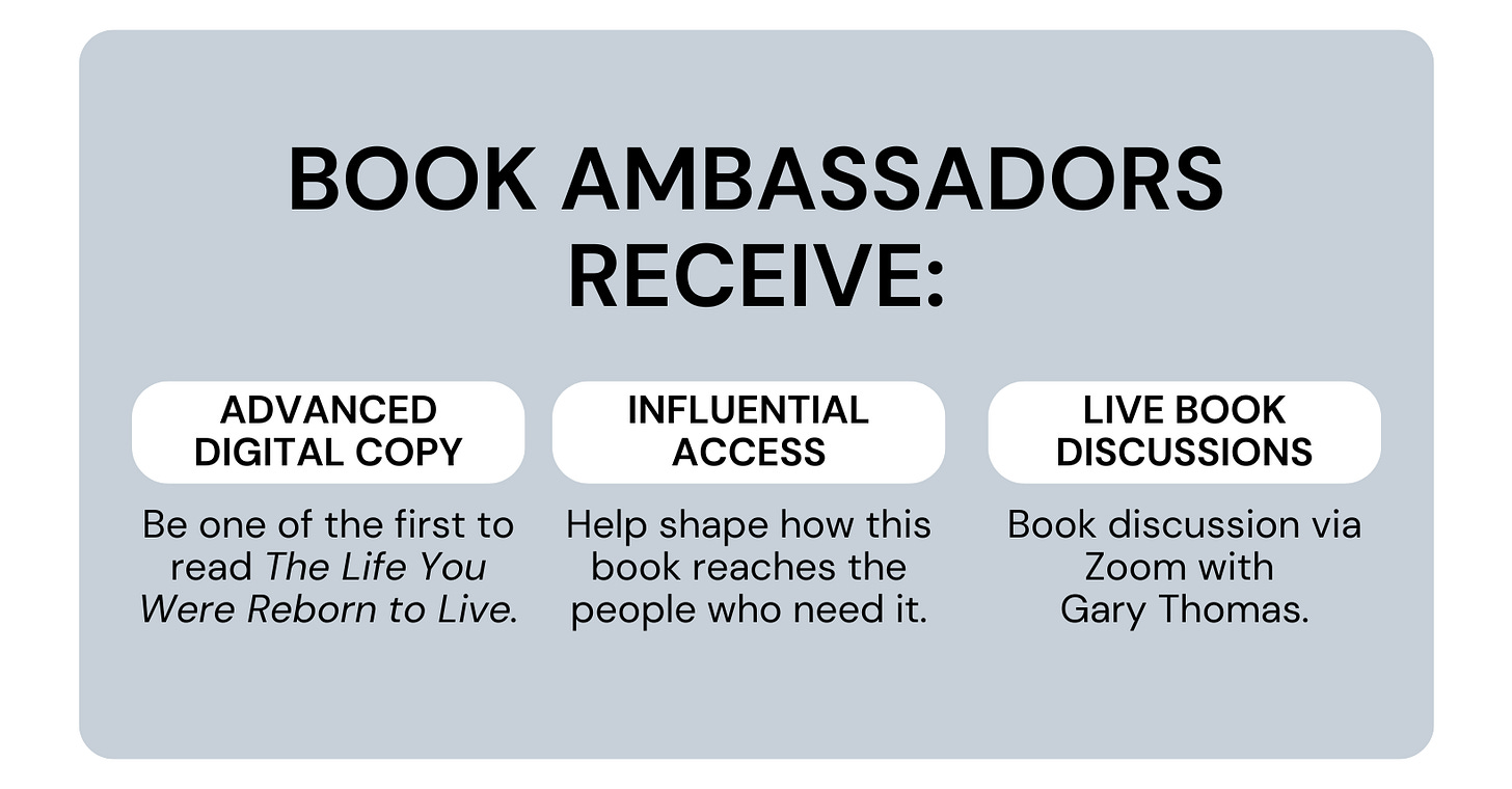 Thank you for your interest in Gary Thomas’s book, The Life You Were Reborn to Live, which is releasing on October 7th from Zondervan.